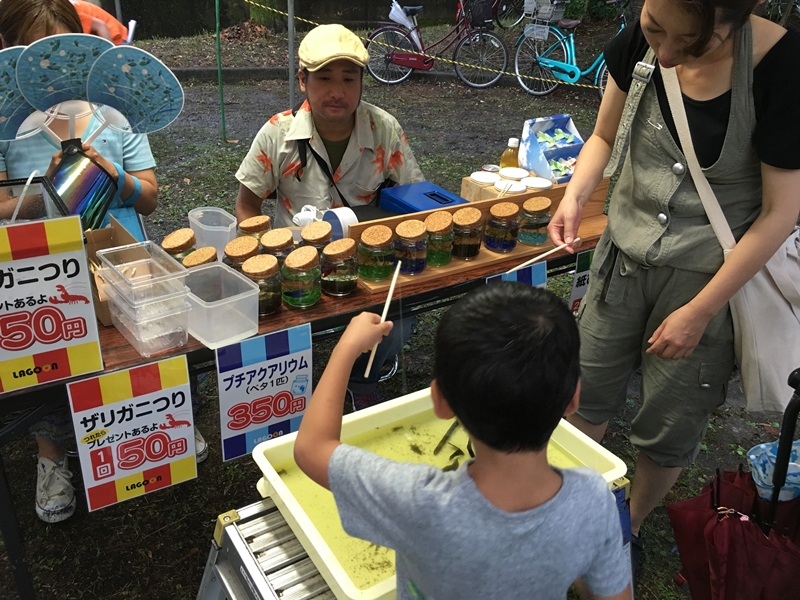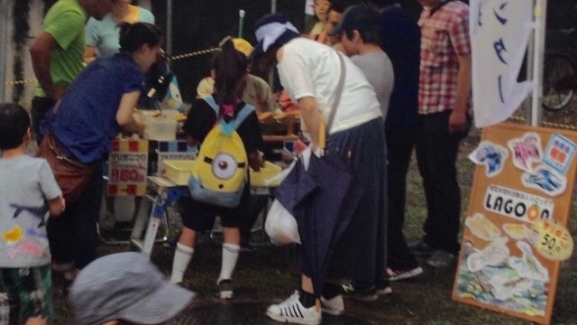 夏の夜市に参加してきました。 投稿日時: 2017年7月24日 投稿者: LAGOON 7月22日(土)村山公園で開催された「夏の夜市」に参加してきました。 当日は開催時間前にゲリラ豪雨があり、どうなることかと思いましたが開催時間には雨もやみ、開催となりました。 雨上がりの公園なので足元が泥んこまみれになりながらも沢山の子供たちがザリガニ釣りを楽しんでくれました。 ザリガニ釣りをしてくれた人には釣れても釣れなくてもメダカを2匹ずつプレゼント。ザリガニを連れて帰りたい子供もいたのですが、事情を説明し、メダカでがまん、がまん。 みんな大切に育ててあげてね~!(^^)!