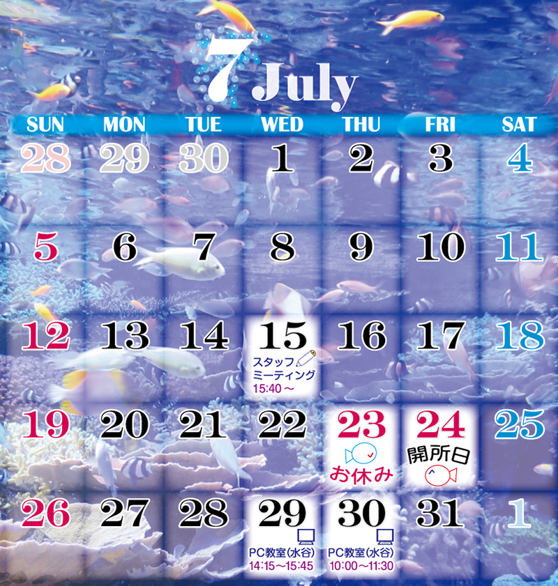 7月スケジュールのお知らせ 投稿日時: 2020年6月30日 投稿者: Administrater 7月のラグーンスケジュールは下記の通りです。 7月15日(水) スタッフミーティング (開所時間は10:00~15:00) 7月24日(金) 開所日 7月29日(水) パソコン教室① (14:15~15:45) 7月30日(木) パソコン教室② (10:00~11:30) 久しぶりの休日開所となりますので 卒業生のみなさんも、ぜひ遊びに来てください。 お待ちしております。