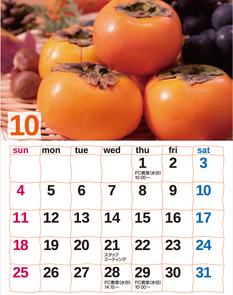 10月スケジュールのお知らせ 投稿日時: 2020年9月29日 投稿者: Administrater 10月カレンダーのお知らせは下記の通りです。 10月21日(水)スタッフミティーング 開所時間は (10:00~15:00) 10月28日(水)パソコン教室① (14:15~15:45) 10月29日(木)パソコン教室② (10:00~11:30) 涼しい秋風に、高く澄んだ空。大きく深呼吸したくなるような、気持ちの良い季節ですね。 実りの秋を満喫してどうぞお元気にお過ごしください。