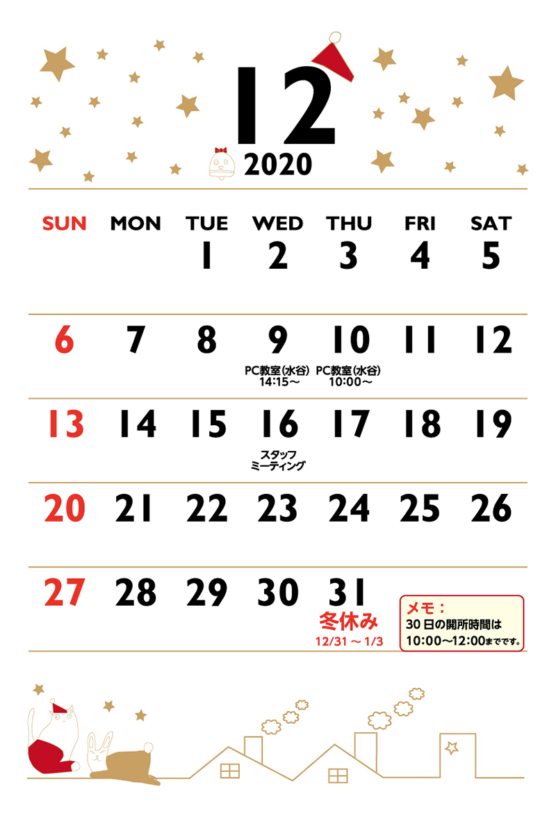 12月スケジュールのお知らせ 投稿日時: 2020年12月1日 投稿者: Administrater 12月09日(水)パソコン教室①(14:15~15:45) 12月10日(木)パソコン教室②(10:00~11:30) 12月16日(水)スタッフミーティング(作業終了時刻 15:00) 12月30日(水)最終開所日(10:00~12:00) 12月31日(木)~ 1月3日(日)冬休み 舞い散る枯れ葉や冷たい風に、本格的な冬の訪れを感じるこの頃ですね。 木枯らしに負けませんようどうぞお元気でお過ごしください。