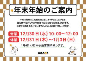 年末年始の開所・お休みのご案内 投稿日時: 2020年12月15日 投稿者: Administrater 年末年始の開所・お休みは下記の日程となっております。 12月30日(水)の開所最終日は 大掃除と年賀状コンテスト表彰式を予定しております。 尚、昨今の事情を顧みて、今年は忘年会は開催せず、 年賀状コンテスト表彰式のみメンバーさんと職員で行うこととなりました。 コンテストの結果は、また後日お知らせ致します。 皆さまにとってよいお年となりますようお祈りしております。