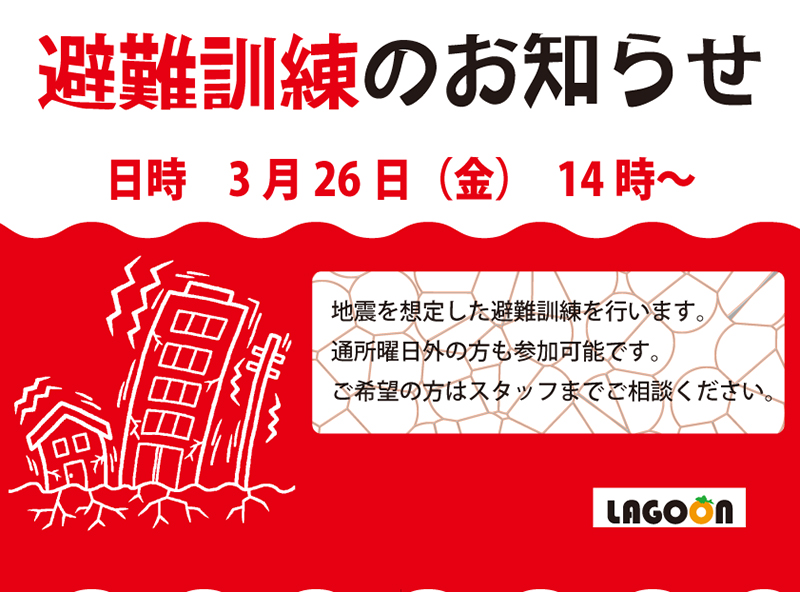 避難訓練のお知らせ 投稿日時: 2021年3月23日 投稿者: Administrater 3月26日(金)14時からラグーンにて地震を想定した避難訓練を行います。 通所曜日以外の方の参加も可能です。ご希望の方はスタッフにお声がけ下さい。 近年大きな地震が起こることが多くなっています。 是非この機会に地震が起きた時の身の守り方を学びましょう。