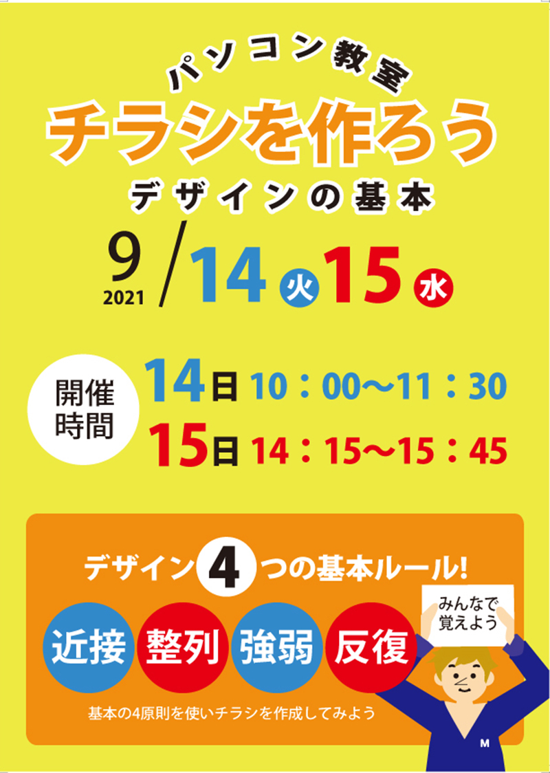 パソコン教室 投稿日時: 2021年9月7日 投稿者: Administrater チラシを作ろう 詳細はこちらから 「デザインの4つの法則」を使いチラシを完成させます。 予習復習をしてチラシを作れるように目指しましょう。