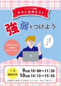 11月のパソコン教室 投稿日時: 2021年10月28日 投稿者: Administrater チラシを作ろう3 クリックで拡大 今回も「デザインの4つの法則」の中の「強弱」を使い、チラシを制作します。 前回の内容を復習しておきましょう。 ※開催日が変更となる場合がございます。予めご了承下さい。