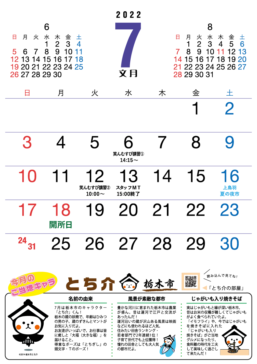 7月スケジュールのお知らせ 投稿日時: 2022年6月29日 投稿者: Administrater 7月のスケジュールは下記の通りです。 画像クリックで拡大 今月の「ご当地キャラ」は栃木市の「とち介くん」です。