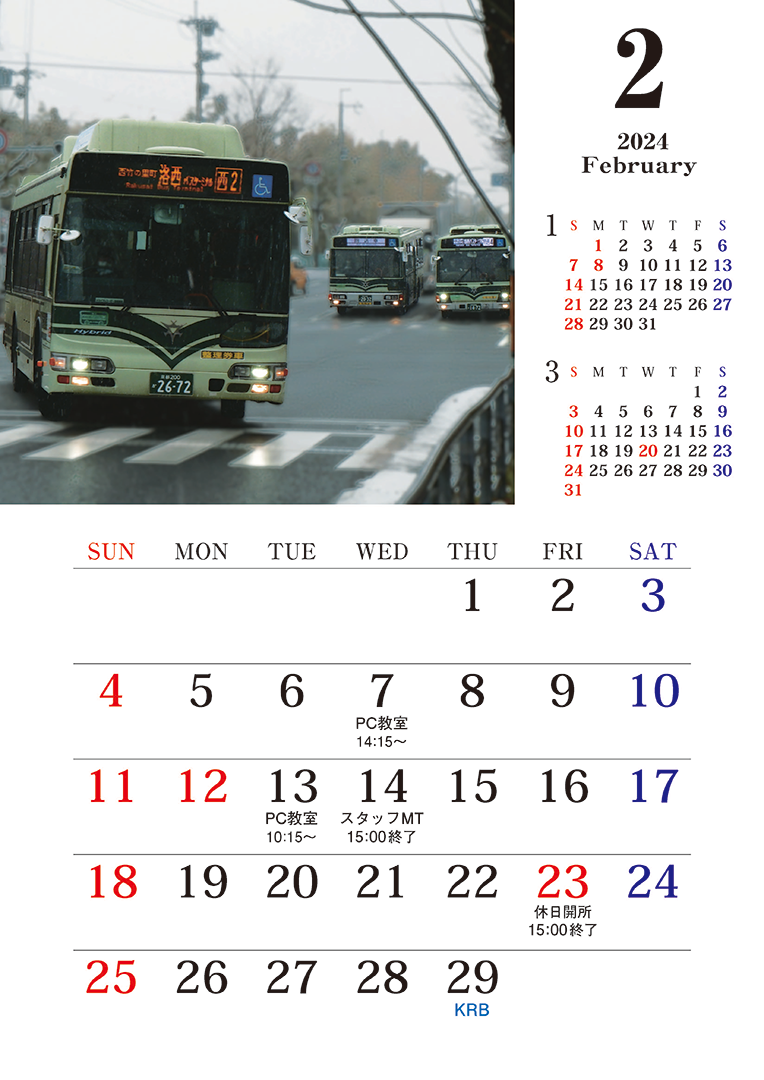 今回の制作現場では、印刷した時に写真の色が思うように出ず調整に苦労しました。LAGOONでは通所メンバー向けに紙ベースのカレンダーも配布しているのですが、初回の印刷では「どこのバス!?」と目を疑うほど我が街を走る市バスとはかけ離れた枯葉色(泣)。何度かの試し刷りを重ねてはパソコン画面とにらめっこを繰り返し、最終的には納得のいく仕上がりになったと思います。みなさんいかがでしょうか??